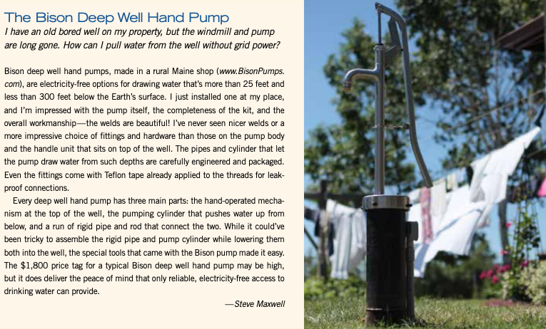Bison deep well hand pumps, made in a rural Maine shop (www.BisonPumps.com), are electricity-free options for drawing water that’s more than 25 feet and less than 300 feet below the Earth’s surface. I just installed one at my place, and I’m impressed with the pump itself, the completeness of the kit, and the overall workmanship — the welds are beautiful! I’ve never seen nicer welds or a more impressive choice of fittings and hardware than those on the pump body and the handle unit that sits on top of the well. The pipes and cylinder that let the pump draw water from such depths are carefully engineered and packaged.